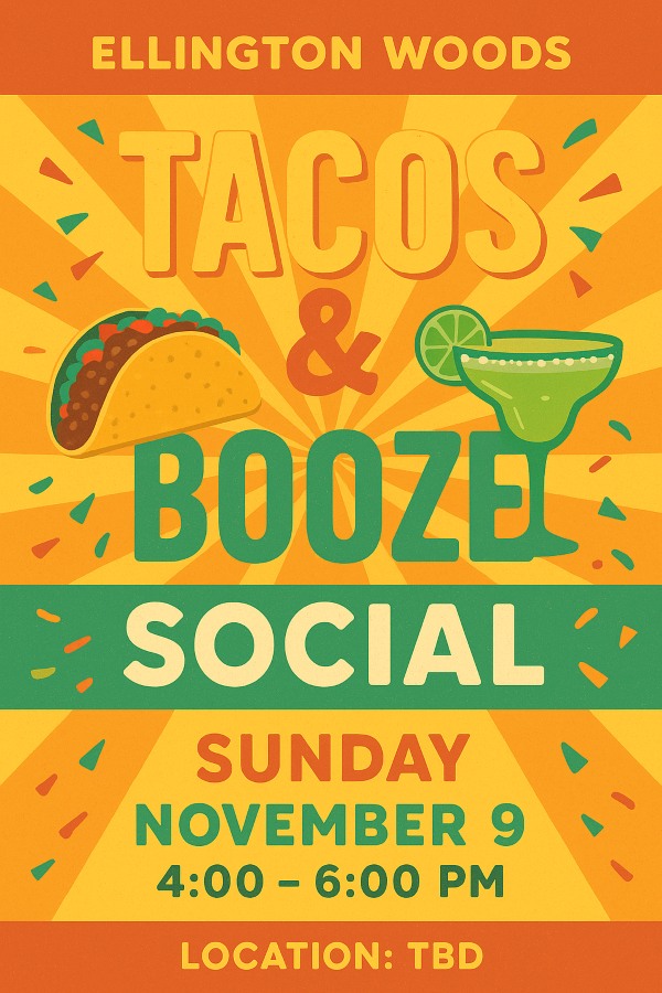 🌮🍹 Ellington Woods Tacos & Booze Social – Saturday, Nov 9th, 4–6 PM